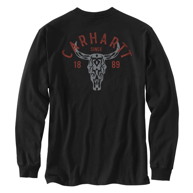 The Carhartt Men's Heavyweight Longhorn Graphic Long Sleeve T-shirt is designed for durability and comfort. Made from heavyweight cotton jersey, this shirt is perfect for tough workdays, providing ample room for movement. The distinctive Longhorn graphic adds a touch of Western style, making it a versatile addition to your wardrobe.