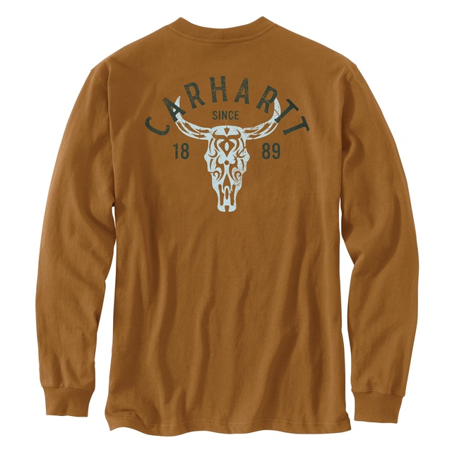 The Carhartt Men's Heavyweight Longhorn Graphic Long Sleeve T-shirt is designed for durability and comfort. Made from heavyweight cotton jersey, this shirt is perfect for tough workdays, providing ample room for movement. The distinctive Longhorn graphic adds a touch of Western style, making it a versatile addition to your wardrobe.