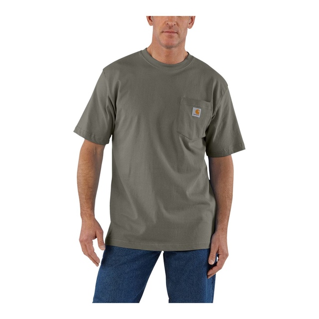 The Carhartt Men's Heavyweight Pocket T-Shirt is designed for comfort and durability. Made from heavyweight cotton that softens with wear, it features Carhartt's original roomy fit for easy movement. The side-seamed construction prevents twisting, while the rib-knit crewneck and tagless label provide all-day comfort.