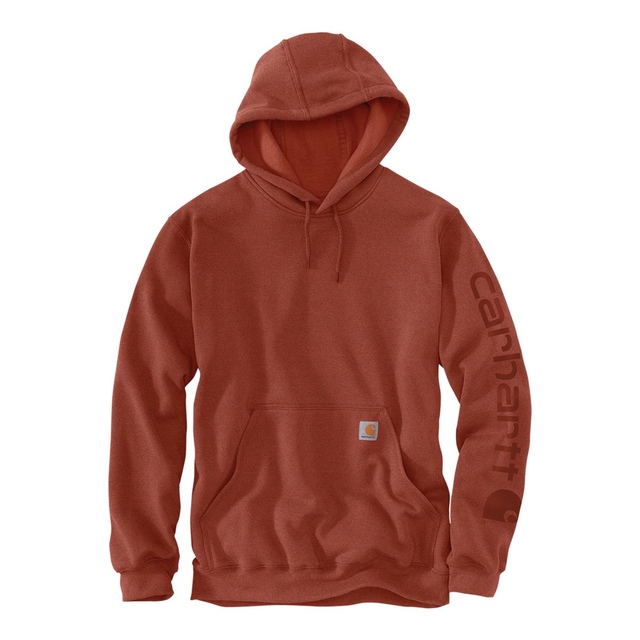 The Carhartt Men's Logo Sleeve Pullover Hoodie combines warmth, comfort, and Carhartt's legendary durability. Made from a cotton blend with triple-stitched seams, it offers a loose fit for easy movement. The spandex-reinforced cuffs and waistband provide a snug, flexible fit, while the front handwarmer pocket and adjustable three-piece hood offer added comfort and protection.