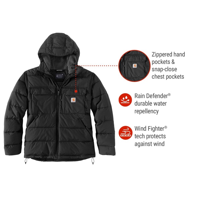 When the weather is cool and damp, this men's Carhartt rain jacket offers insulated warmth to keep you working. It blocks the wind and sheds light rain. Synthetic down insulation plus a sherpa fleece lining in the upper body seal in heat. Knit cuffs and an adjustable hood further seal out the cold as you bend and move. Pockets inside and out offer plenty of storage. A loose fit offers Carhartt's roomiest cut.