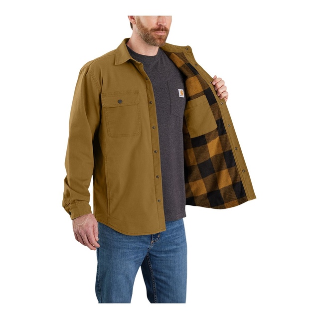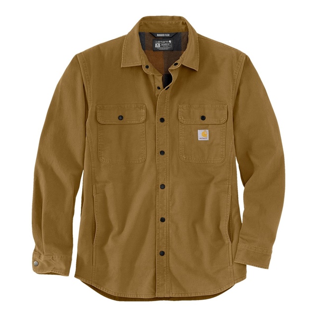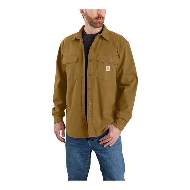 The Carhartt Men's Rugged Flex Canvas Fleece Lined Durable Warm Jacket is perfect for layering on cooler days. This shirt jacket is made of canvas with built-in flex to provide the range of motion needed on the job. The relaxed-fit layer comes equipped with handwarmer pockets and two snap pockets for small valuables as this fleece-lined shacket features a spread collar and two-snap adjustable cuffs with extended plackets for a secure fit and added protection.