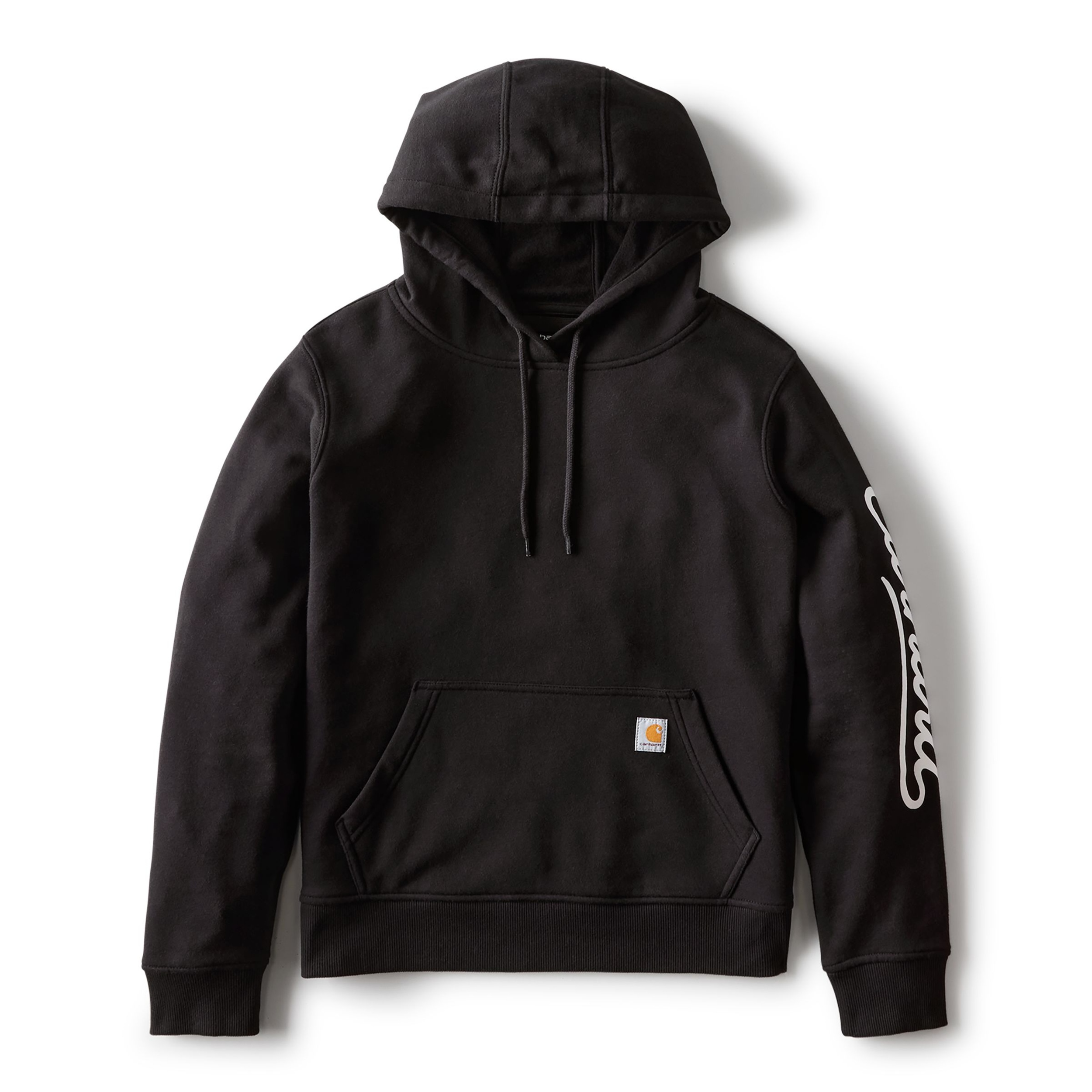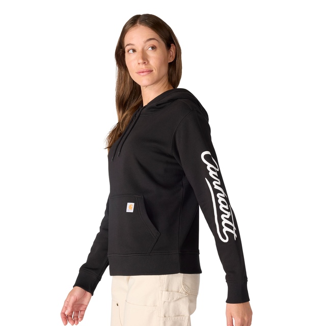 Embrace casual comfort with the Carhartt Women's Sawyer Script Hoodie. This relaxed-fit hoodie features a stylish graphic on the sleeve and a three-piece hood for added warmth. The cotton-blend fleece construction ensures durability and a cozy feel, making it ideal for everyday wear.