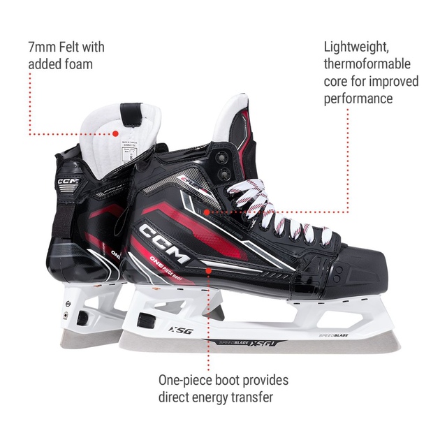 Sustain the same level of intensity all game long with the EFLEX 6.9 goalie skates. Made of NHL-caliber composite material, they're lightweight, stiff and thermoformable to keep you agile on your feet no matter what the game throws at you. The asymmetrical flex stance contour gives you a deep flex for lightning quick movements without restrictions, while the one-piece boot offers a more direct energy transfer and closer fit for total control around your crease.