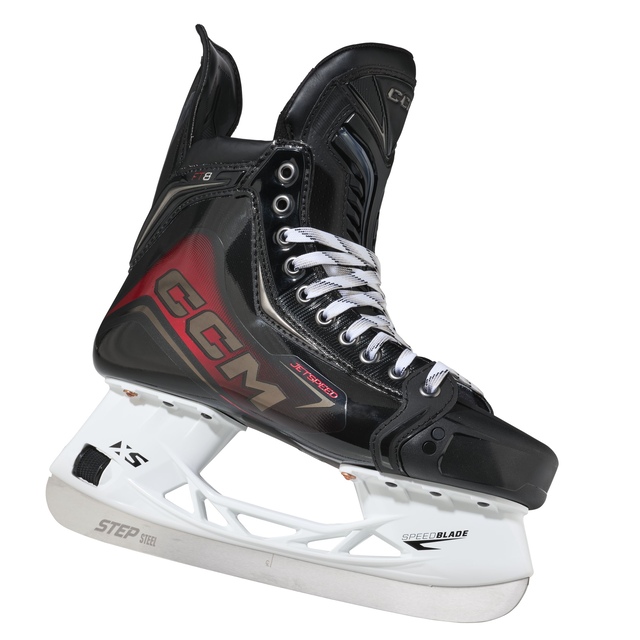Unlock superior speed and agility with the JETSPEED FT8 skates, featuring a one-piece boot and Game Ready Fit for an aggressive, quick-shifting stance. Crafted with 3D molded RFM composite, these skates offer NHL-caliber durability and lightness. The new forward pitch angle provides a more natural attack stance, allowing players to be quicker on their toes and feel more explosive in their strides. The Totaldri Pro liner ensures your feet stay dry and odour-free. Inside, multi-layered ADPT Memory Foam cradles your feet for comfort and reduced fatigue. The ADPT Comfort tongue and lightweight midsole enhance forward flex and energy transfer. Quick blade changes are a breeze with the SpeedBlade XS holder and STEP Steel blades deliver superior edge control and longevity.