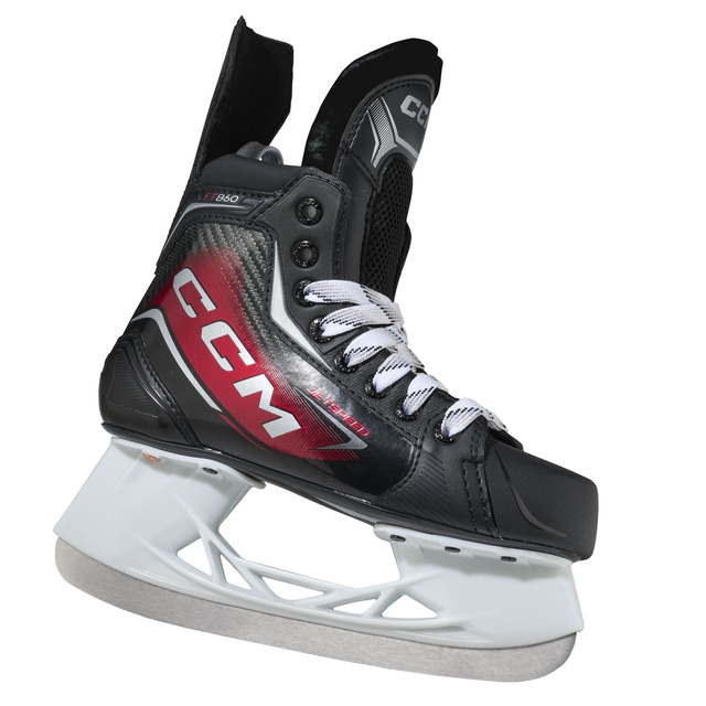 The JETSPEED FT860 junior skates offer a lightweight and durable design for young players. The 2D quarter with faux carbon skin provides an ergonomic fit with lasting support. ADPT memory foam ankle pads create a snug, comfortable interior, while the 7mm felt tongue with 3D mesh lacebite protection enhances flexibility and reduces pressure. Equipped with a CCM SpeedBlade holder for optimal flex and pre-sharpened stainless steel runners, these skates are ready for the ice.
