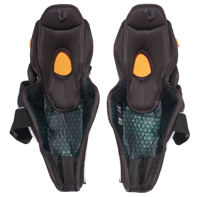 Tapered anatomical pro-level molded PE shin caps with ventilation ports & strap groove: Pro-level shin cap offers closer fit for better protection & less interference with integrated padding in its reinforced frame + ventilation ports for added breathability