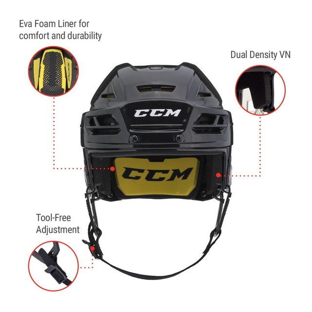 The CCM Senior Tacks 210 Hockey Helmet delivers outstanding protection and comfort on the ice. Crafted with a dual density VN + EVA foam liner, it provides excellent impact absorption and a secure, head-hugging fit. The single tool-free adjustment system allows for easy customization to achieve a personalized, snug fit every time. The sleekly designed shell maximizes protective capabilities while maintaining a low profile look. Thin round wires of the CCM Tacks 210 Helmet enhance visibility, and the multi density foam chin cup ensures high levels of comfort and protection.