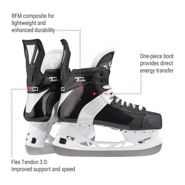 One-piece boot Power with Game Ready Fit: Amplified power and explosiveness from every stride with a more responsive boot construction delivering even better energy transfer. Higher in-step volume, via extended facings, delivers a more generous fit in the midfoot for elite TACKS skaters