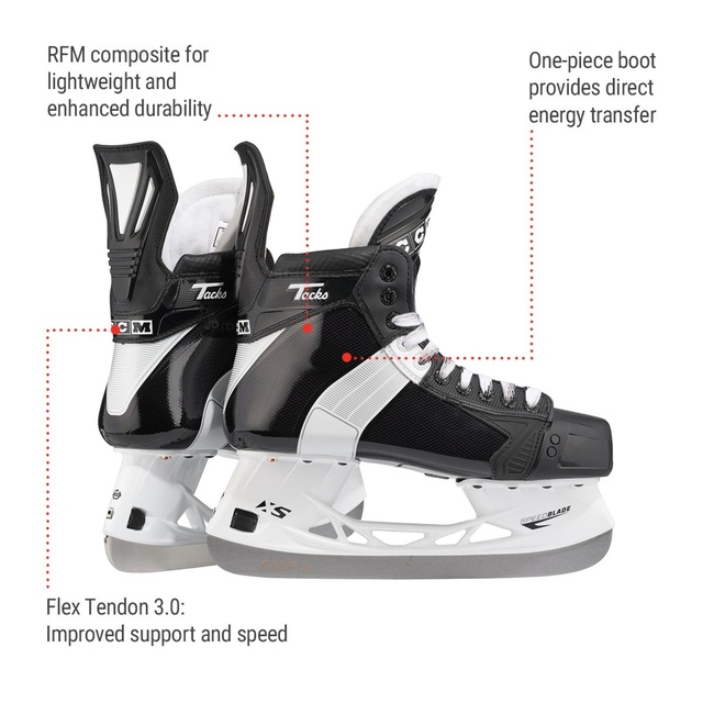 One-piece boot Power with Game Ready Fit: Amplified power and explosiveness from every stride with a more responsive boot construction delivering even better energy transfer. Higher in-step volume, via extended facings, delivers a more generous fit in the midfoot for elite TACKS skaters