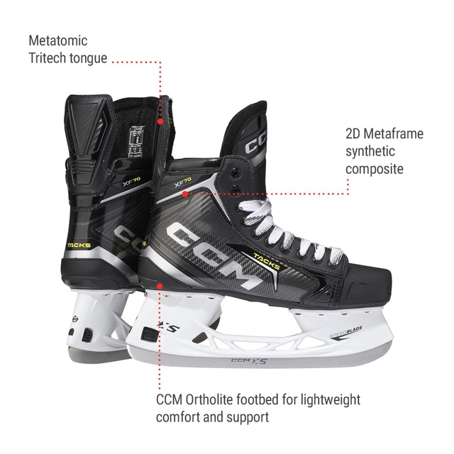 Built for maximum comfort, the all-new TACKS XF70 feels great out of the box and delivers performance on the ice. Its 2D Metaframe synthetic composite provides an ergonomic shape within a light and durable boot construction. ADPT Memory foam around the ankles, added comfort pad at the boot cut, and layered liner foams wrap nicely around your foot so that these skates will feel great the minute you put them on.