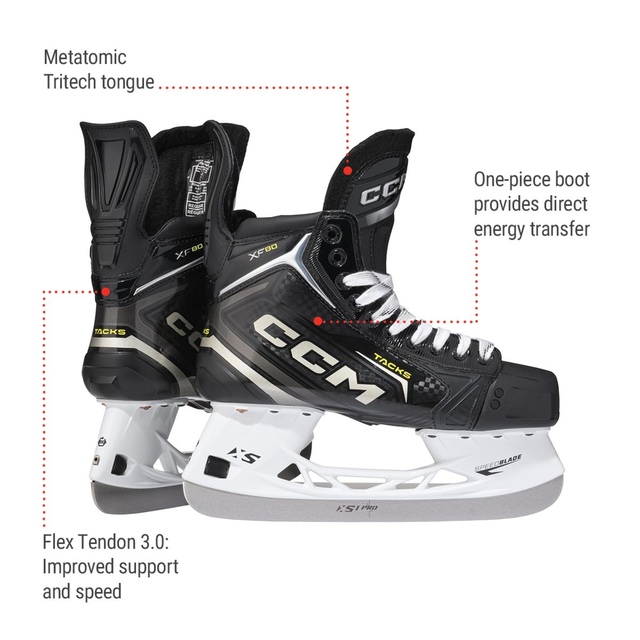 The TACKS XF80 skate features CCM’s one-piece boot construction for more direct energy transfer and a closer fit so that you get the most out of every skating stride. Equipped with new and improved XS PRO Stainless runners with added height and thickness to give you the ultimate edge over your opponent. The Flex Tendon 3.0 provides a range of motion and improved agility, coupled with improved ankle foams for comfort, you will feel great and play great.