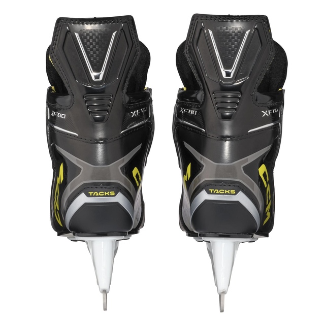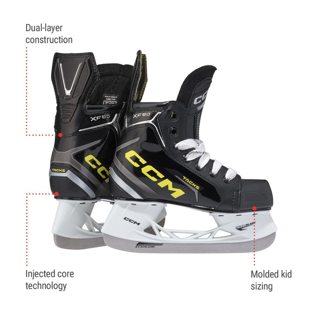 Maximize your young players' ice time with the TACKS XF80 Youth skates, designed with injected core technology and a cool chrome overlay for unparalleled durability and style. ADPT Memory foam around small ankles, paired with SlickTec Heel application, makes it easier than ever to get your young star into their skates and onto the ice.