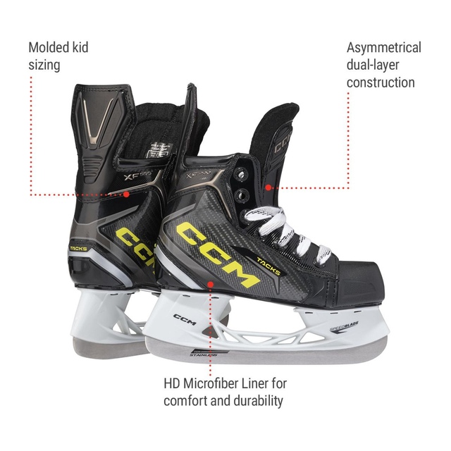 Constructed with the new One-Piece boot featuring ADPT Memory Foam, the TACKS XF PRO Youth skates offer extra reinforcement for structural stiffness and improved performance. Their asymmetrical dual-layer construction provides enhanced forward flexion. A molded insole keeps their foot in place for improved performance. With the CCM Kid Sizing Zone, it's never been easier to fit tiny feet, providing the youngest players in your family with excellent support and comfort in their skates.