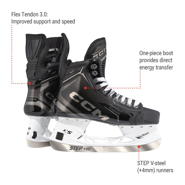 The CCM Tacks XF Senior Hockey Skates redefine performance and comfort for elite players. Built with the innovative One-Piece Boot POWER and Game Ready Fit, these skates enhance responsiveness and energy transfer for powerful strides. Featuring STEP V-Steel blades and an ADPT Comfort tongue with FlexMotion technology, every movement feels effortless.
