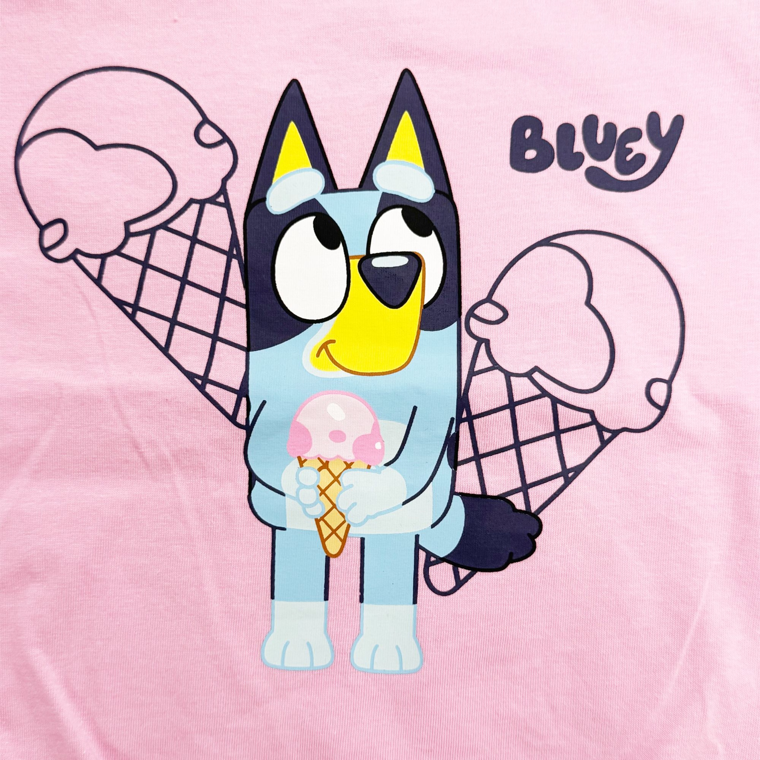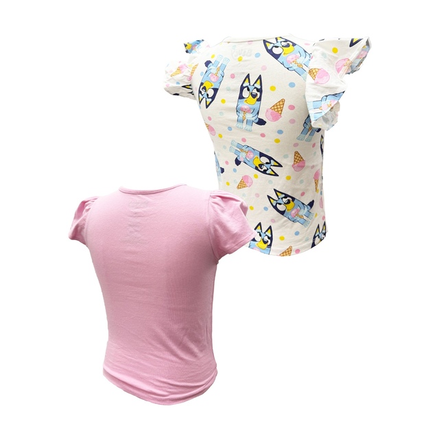 A 2 Piece Bluey combo top set with one in a Pink colour and the other in a Off White colour. The Pink colour features a graphic of Bluey with ice cream and the logo. The Off White colour features a graphic of an all over print of Bluey and Ice Cream.
