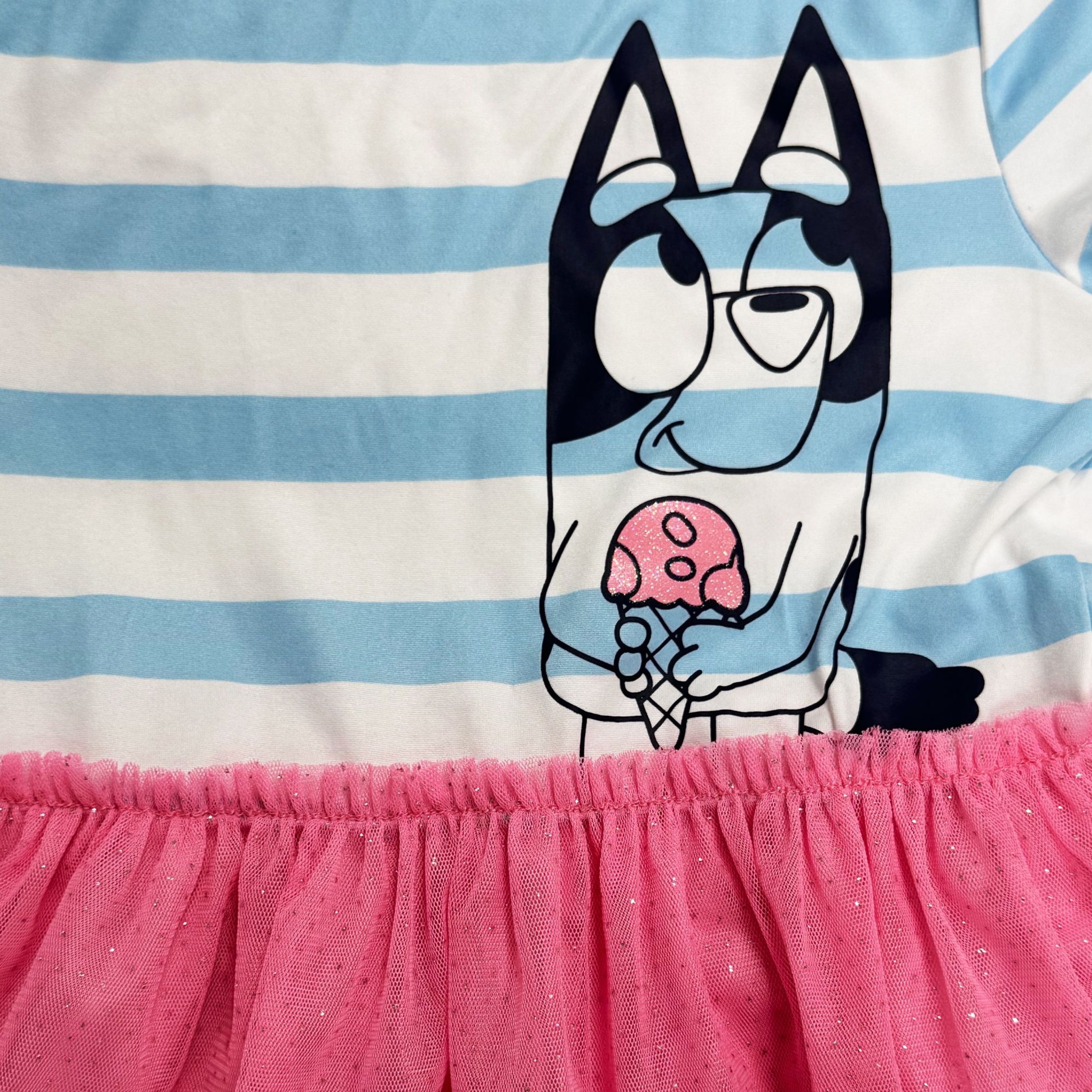 This sweet dress lets your little girl channel her favorite pup Bluey in style. The glittery skirt sparkles as she plays, while the soft fabric keeps her comfy all day. Vibrant colors and a fun graphic bring Bluey's world to life. Made from quality materials, this dress is built to handle your girl's adventures. The lively design pairs well with leggings or bike shorts for a cute, coordinated look. Let your toddler's personality shine through in this cheerful Bluey dress.