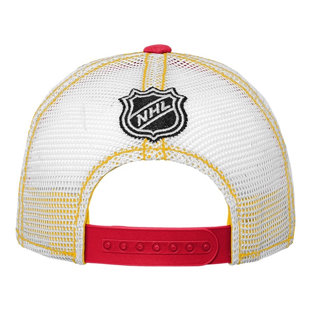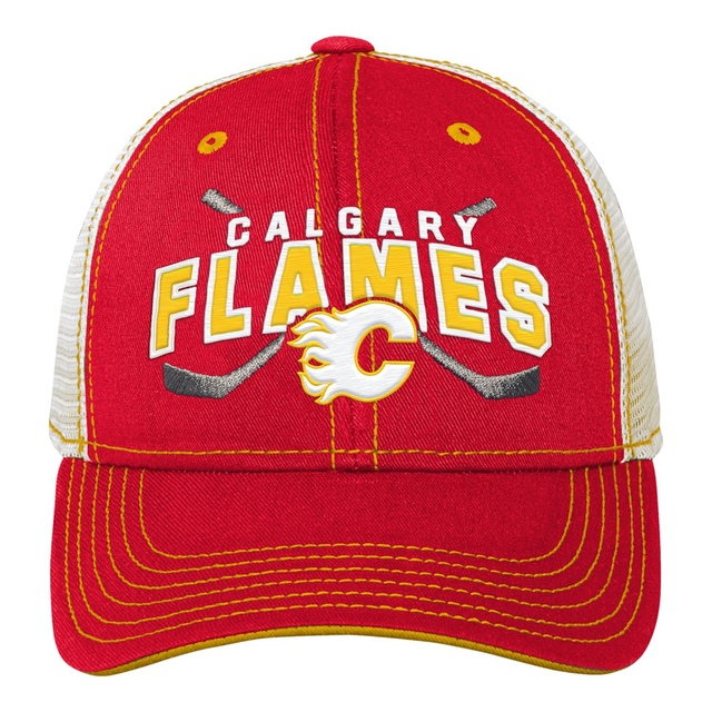 The NHL Lockup Trucker Cap is the perfect hockey adjustable meshback cap for any young Calgary Flames fan. Team color front with team name and logo embroidered lock up. Poly meshback with adjustable closure. NHL Shield back hit for authentication. Kids sizing.