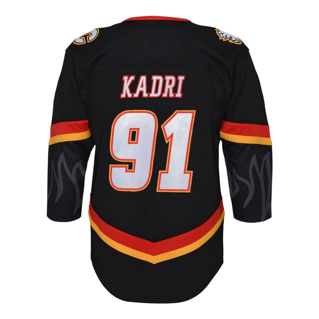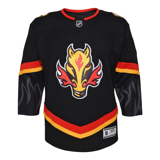 Blasty the Horse has returned on the new Calgary Flames NHL 3rd Alternate Premier black jersey. Iconic alternate logo center chest with modern design and fabrication. Complete with Nazem Kadri #91 authentic sublimated twill name and number. This is a must have jerseys for any young Flames fan. Officially licensed by the NHL. Child size range.