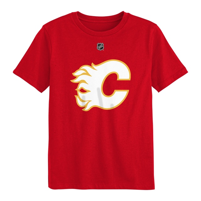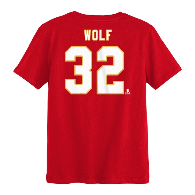This Calgary Flames team colour NHL player name and number short sleeve cotton t-shirt is a must-have for any young Flames fan. Authentic retro red design with Flames team logo screen print at the centre chest. Complete with Dustin Wolf #32 name and number on the back. Officially licensed by the NHL and NHLPA. Child 4-7 size range.