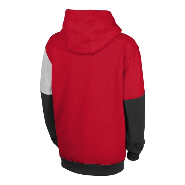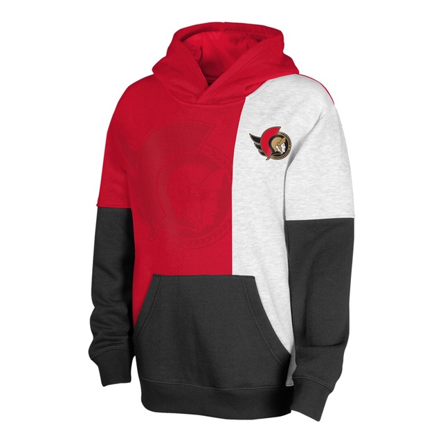 Express your favorite NHL teams colors in the child Prevail color blocked pullover fleece hood. Team and alternate color blocked design with hood and kanga pocket. Soft hand screen print full color team logo at left chest with large shadow team logo on right side. Comfortable cotton polyester fleece fabrication. A colorful and great look for every young NHL fan. Officially licensed by the NHL. Child 4 to 7 size range.
