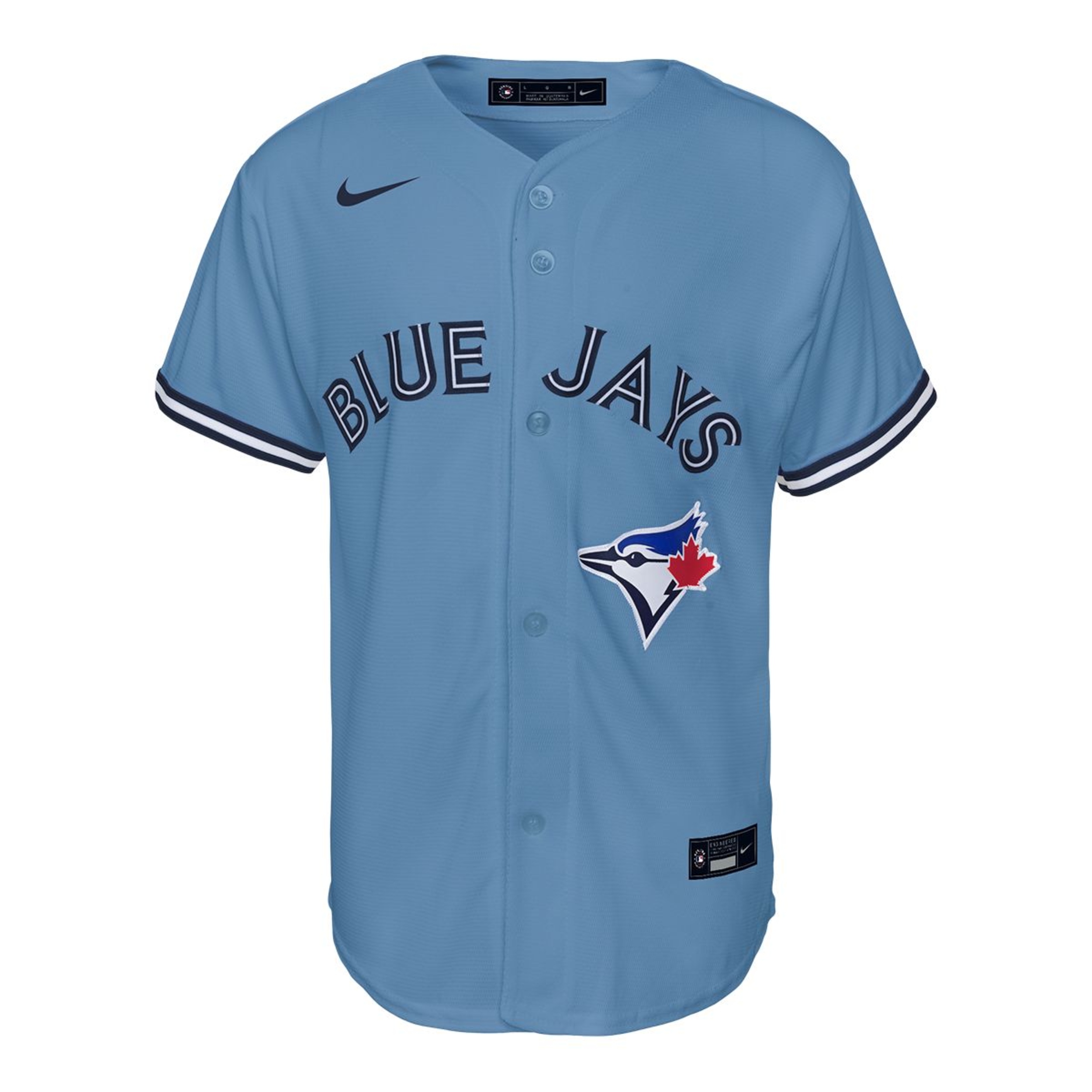 Every little kid will get excited for the big Jays game in this Toronto Blue Jays Nike child sized powder blue Alternate jersey. The Blue Jays team colours and authentic graphics make this jersey a must-have for any young fan.