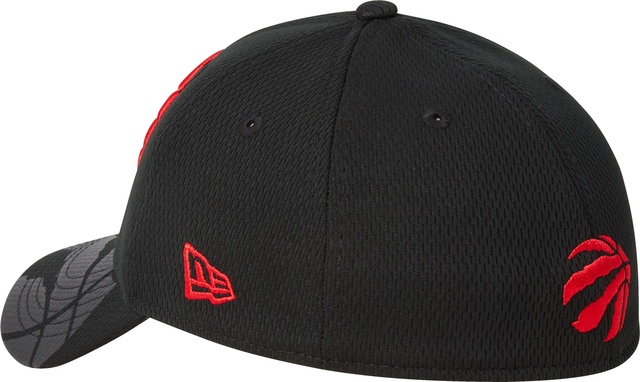 Toronto Raptors youth 39THIRTY stretch fit cap. Black mesh fabric cap with Raptors primary logo embroidered on front and back with an oversized, cropped, Raptors logo printed on visor.