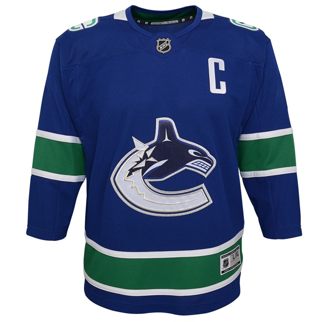 The Child Vancouver Canucks Outerstuff Hughes Jersey is a premier home team color hockey jersey featuring the iconic Orca logo and Quinn Hughes' name and number. Crafted with attention to detail, this officially licensed NHL and NHLPA jersey is a must-have for young Canucks fans. The semi-dull mesh fabrication and polyester interlock knit collar provide breathability and comfort, while the direct sew single-layer twill cresting, embroidered twill front crest, and team identification ensure durability and an authentic look.