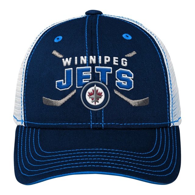 The NHL Lockup Trucker Cap is the perfect hockey adjustable meshback cap for any young Winnipeg Jets fan. Team color front with team name and logo embroidered lock up. Poly meshback with adjustable closure. NHL Shield back hit for authentication. Kids sizing.