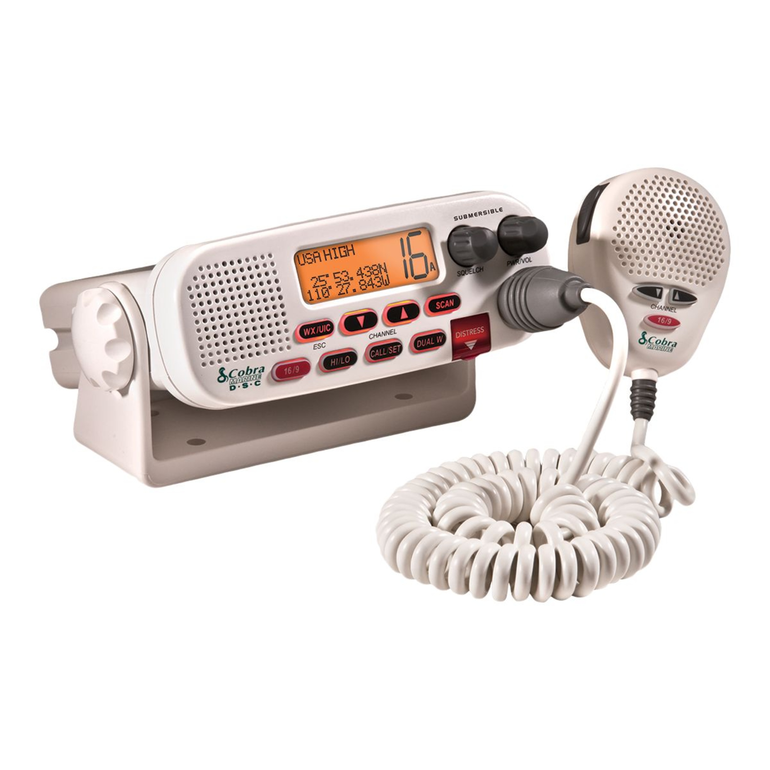 The Cobra 25-Watt Fix Mount Marine Two-Way Radio is a DSC-capable VHF radio designed for safe boating. It provides access to NOAA weather channels, emergency channel 16/9, a signal strength meter, and distress signal transmission. This two-way radio operates on US, Canadian, and international channels and features weather alerts with audible tones and visual alarms for nearby threats.