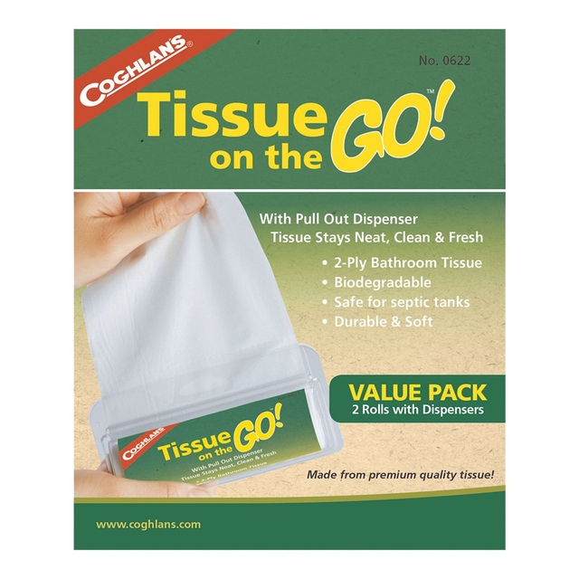 Coghlan's Tissue On The Go is a compact tissue dispenser for travel, camping, hiking, or outdoor adventures. It features a pull-out design that keeps two rolls of 2-ply tissues clean and dry, ensuring you always have fresh tissues for emergencies. The small size of the travel tissue dispenser fits conveniently in a pocket or pack.