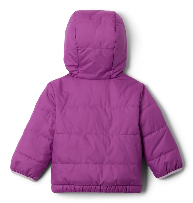 The Columbia Infant Girls' Double Trouble III Insulated Jacket offers a versatile reversible style for little ones. This toddler jacket features water-resistant fabric on one side and a cozy microfleece print on the other, allowing you to easily switch up her look. Insulated with 100 grams per square meter of warmth, it keeps her comfortable in cooler weather. The reversible design and weather protection make this a smart outerwear choice.