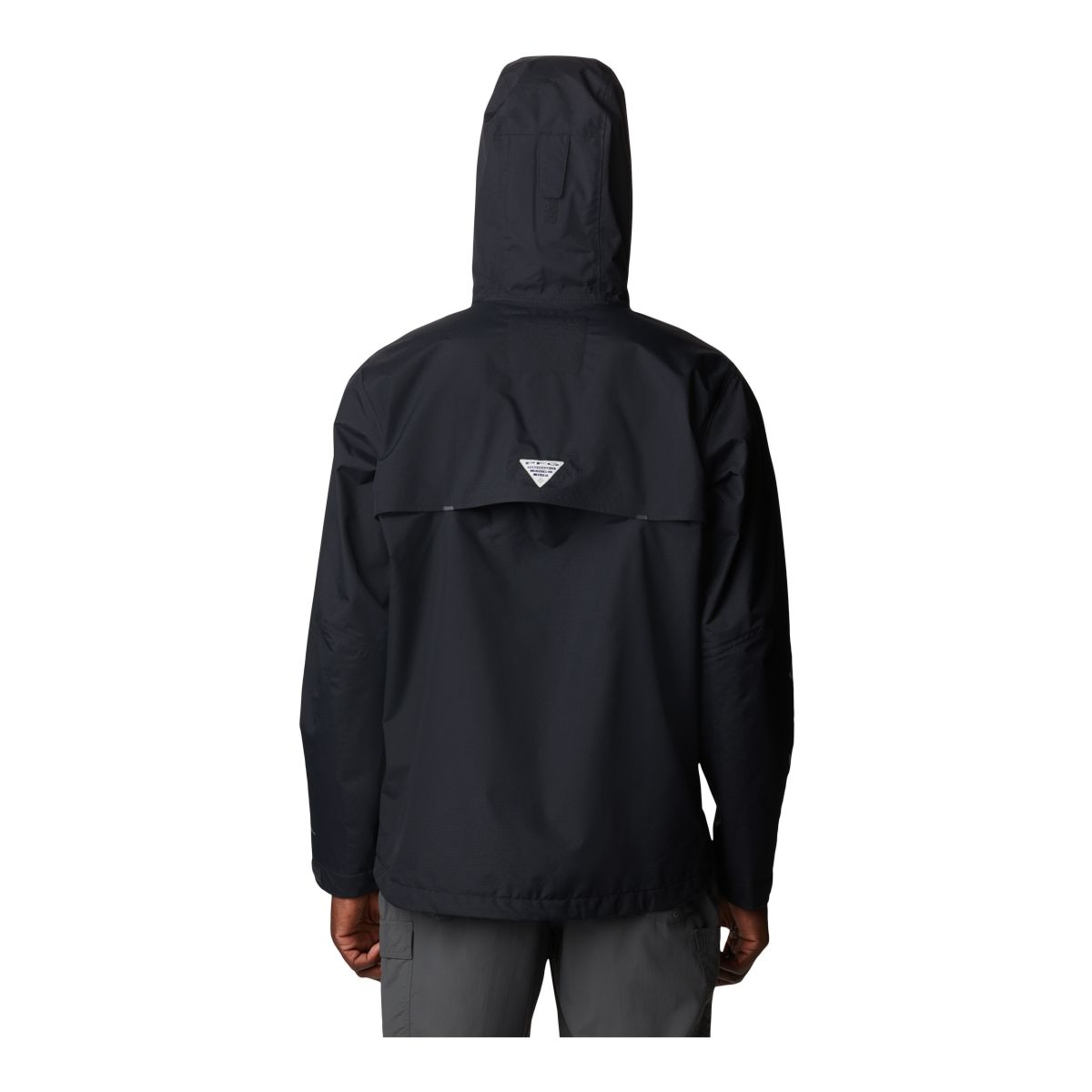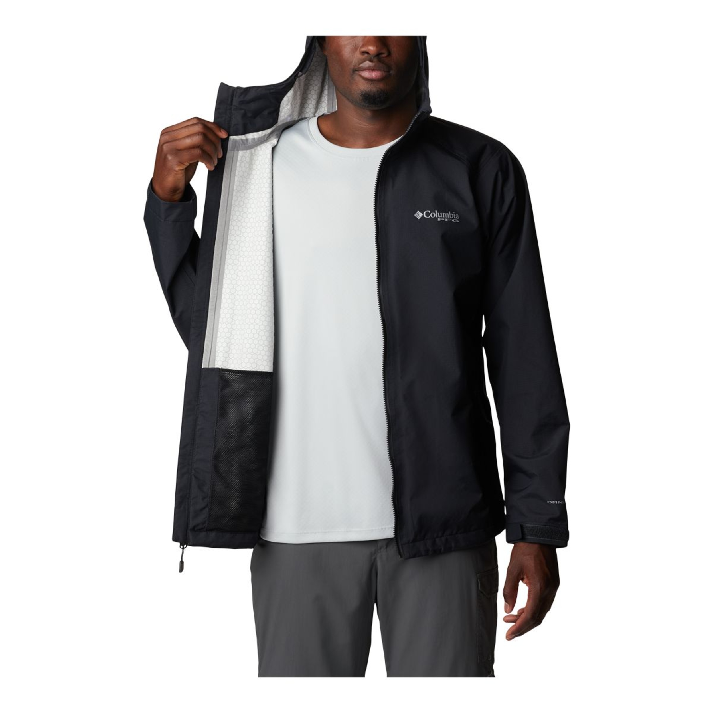Take on wet weather with confidence in the Columbia Men's PFG Rain Jacket. Featuring Omni-Tech™ 3D waterproofing, fully sealed seams and an adjustable storm hood, this jacket helps keep you dry and comfortable. Practical elements include zippered hand pockets for secure storage and adjustable cuffs for custom comfort. This hooded Columbia rain jacket packs down small into a pocket for easy transport when not in use.