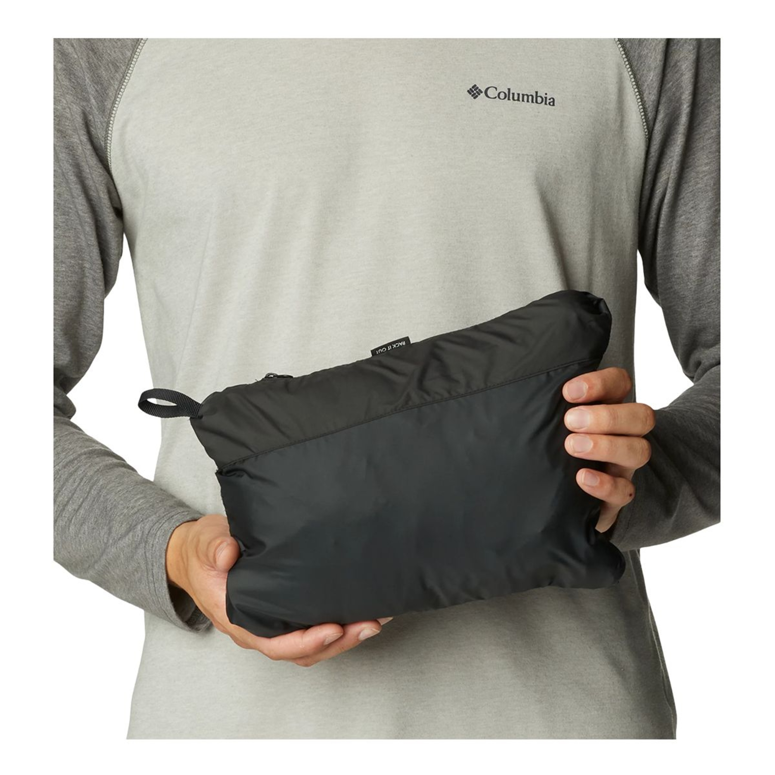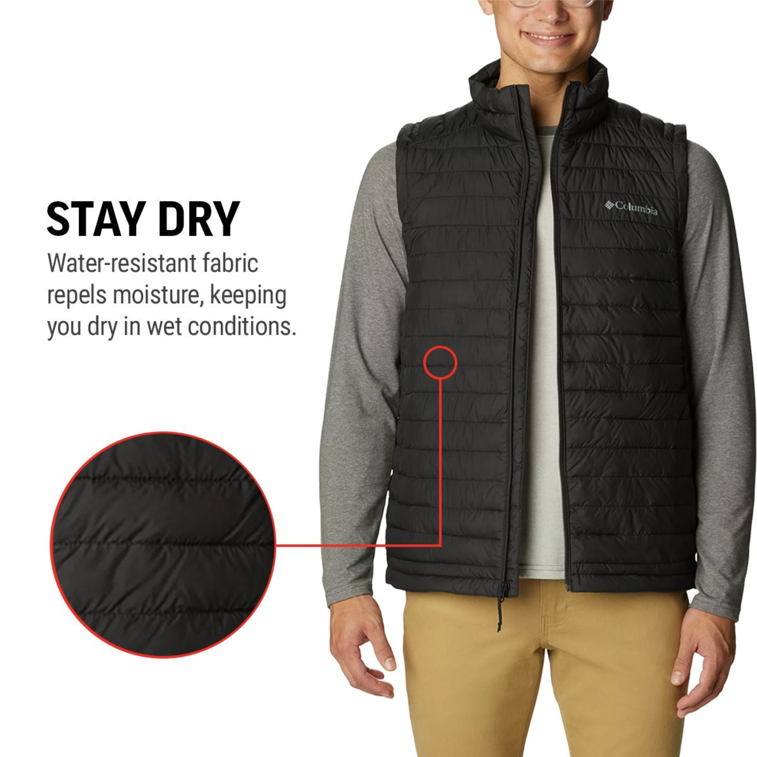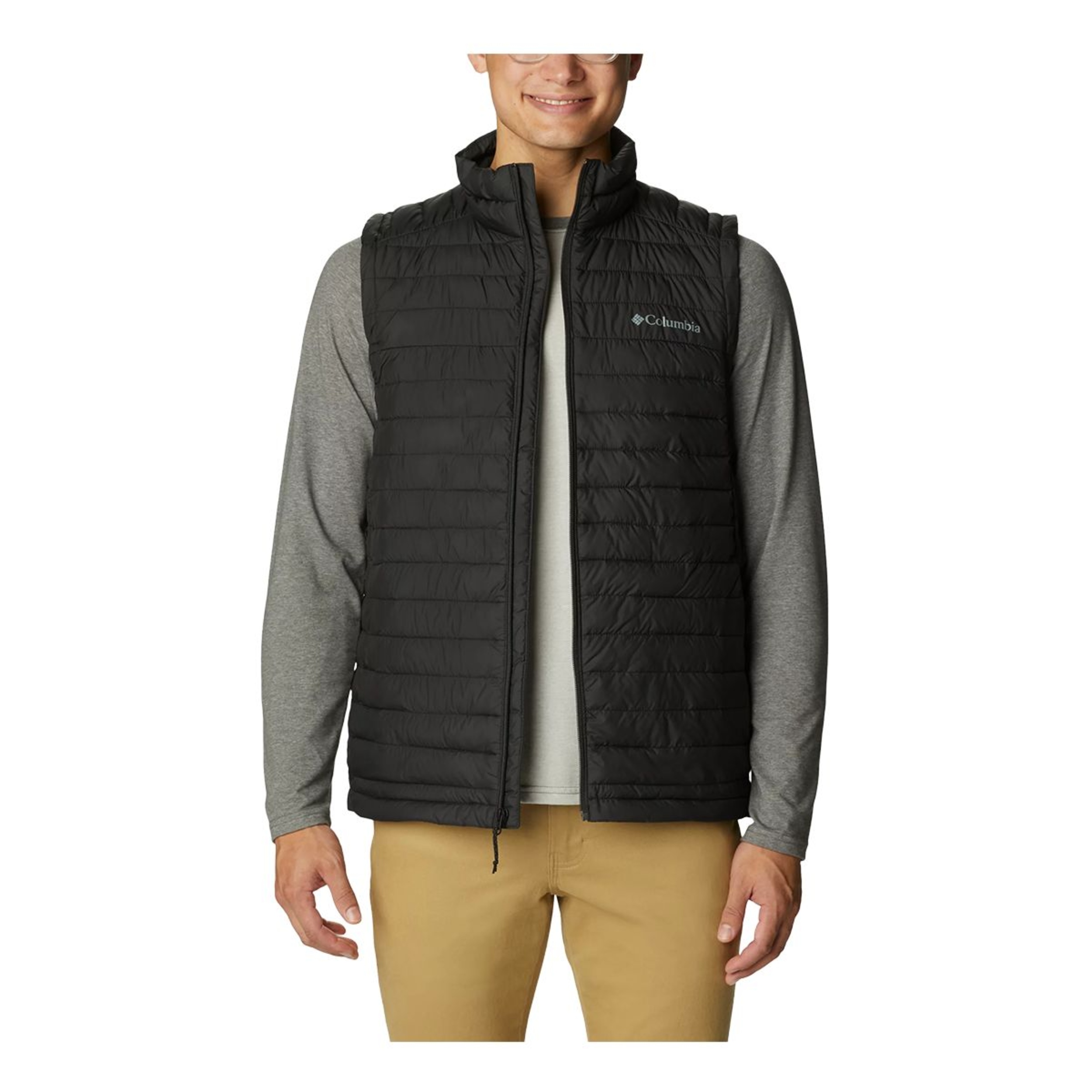The Columbia Men's Silver Falls Puffer Vest features water-resistant fabric and recycled polyester insulation. It includes zippered pockets and a drawcord-adjustable hem. Conveniently packable into a side-front pocket, this Columbia vest blends functionality with environmental mindfulness.