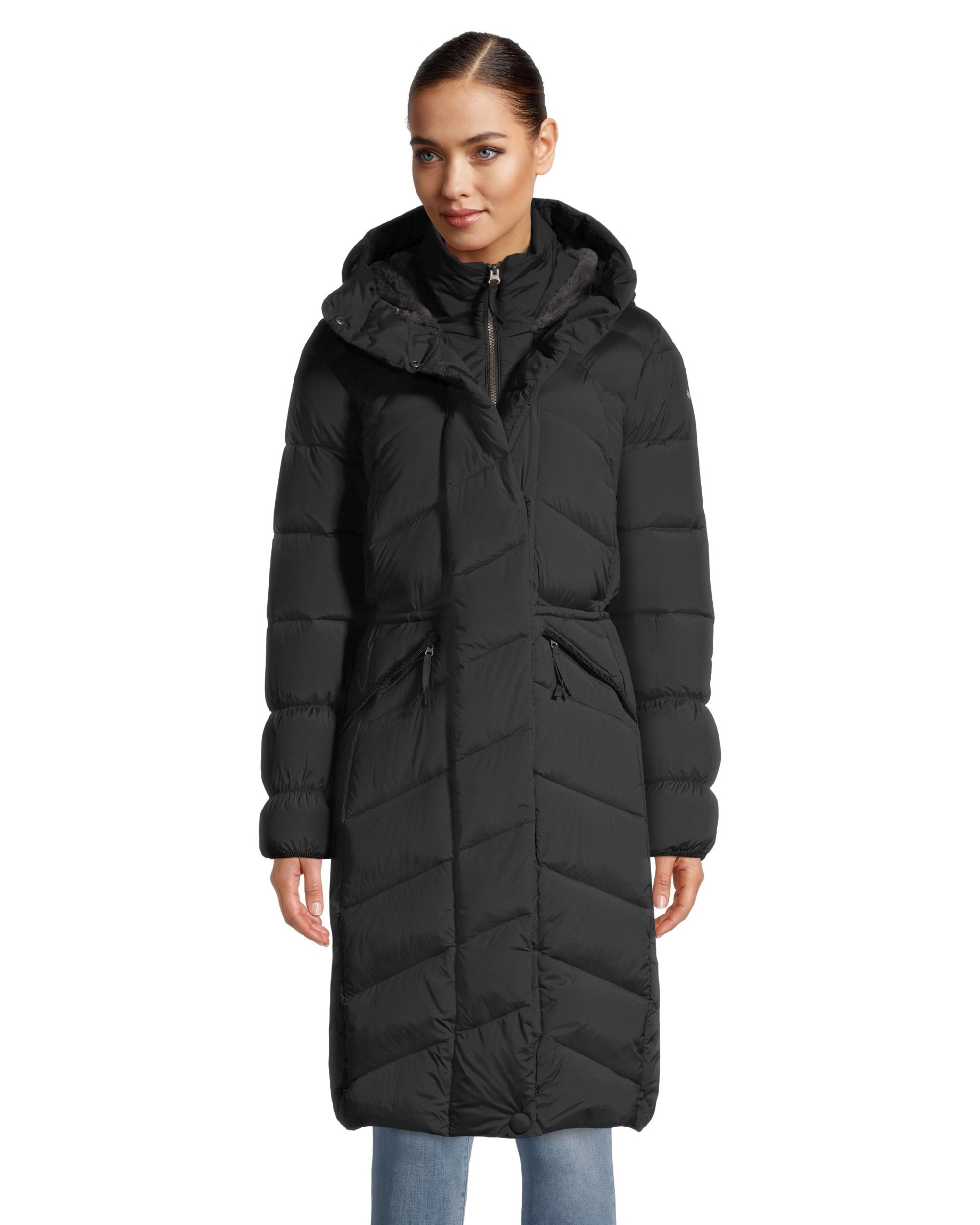 Stay warm in the Columbia Women's Ember Springs Long Winter Jacket featuring 550 fill power down insulation and a Sherpa-lined, adjustable hood. This coat has a two-way zipper, drawcord-adjustable waist, interior security pocket and zippered hand pockets. This Columbia jacket has binding at the cuffs for extra warmth and protection against the elements.