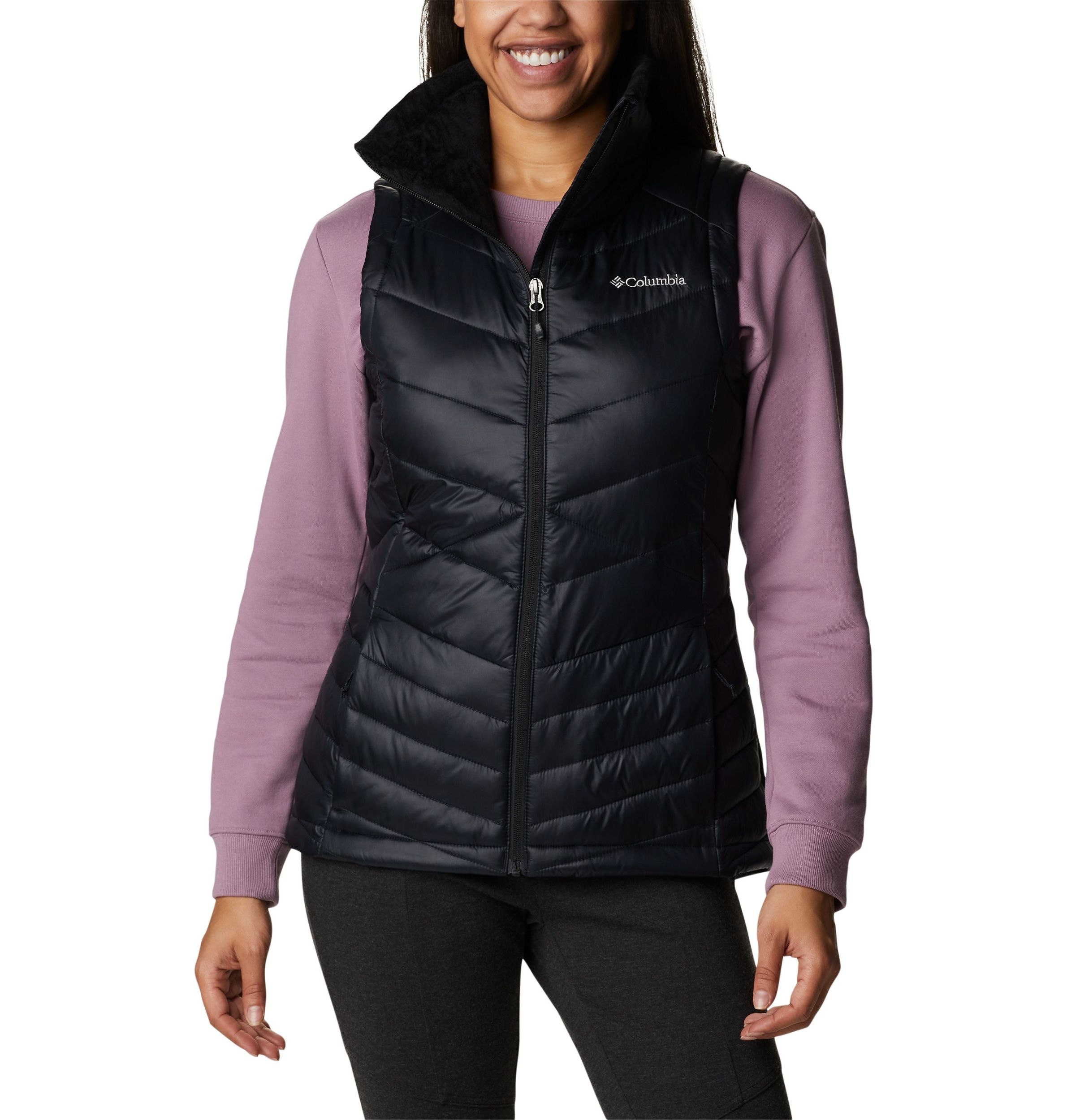Experience warmth without bulk in the Columbia Women's Joy Peak Vest. This semi-fitted vest features Thermarator™ Insulation and Omni-Heat™ Infinity thermal reflective technology to help keep you cozy in the cold. The water-resistant fabric keeps you dry and a plush-lined collar and chin guard offer further protection from the elements. The interior security pocket and zippered hand pockets on this Columbia vest provide plenty of hands-free storage options while you're on the go.