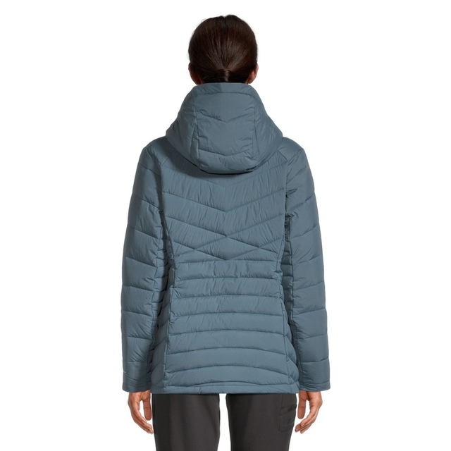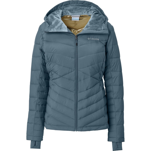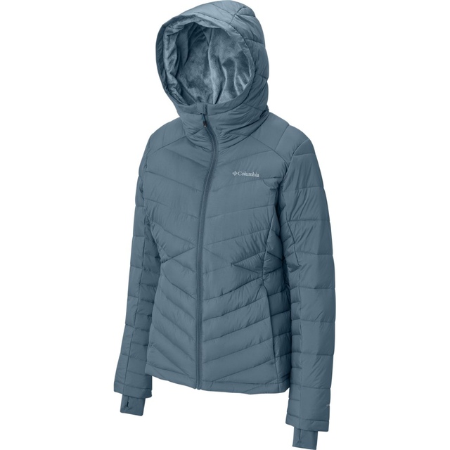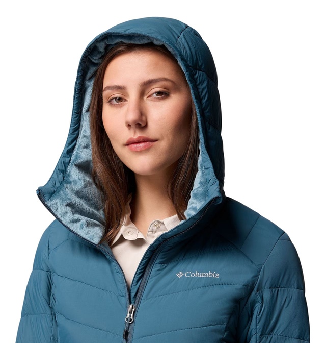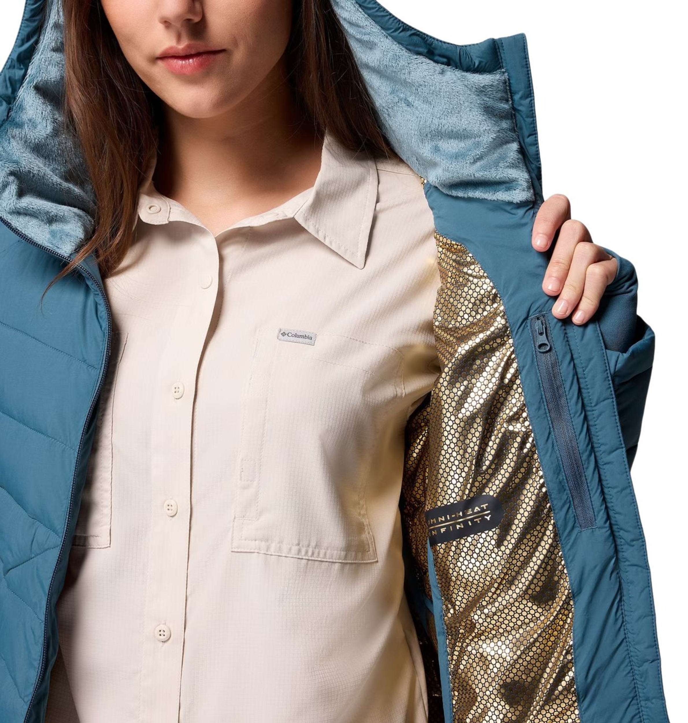 The Columbia Women's Joy Peak™ Insulated Thermal Jacket is perfect for both urban and outdoor adventures. It features a cozy fleece-lined hood and collar, recycled synthetic insulation, and a thermal-reflective lining to retain heat. The water-resistant exterior adds a touch of luxury with its subtle sheen.