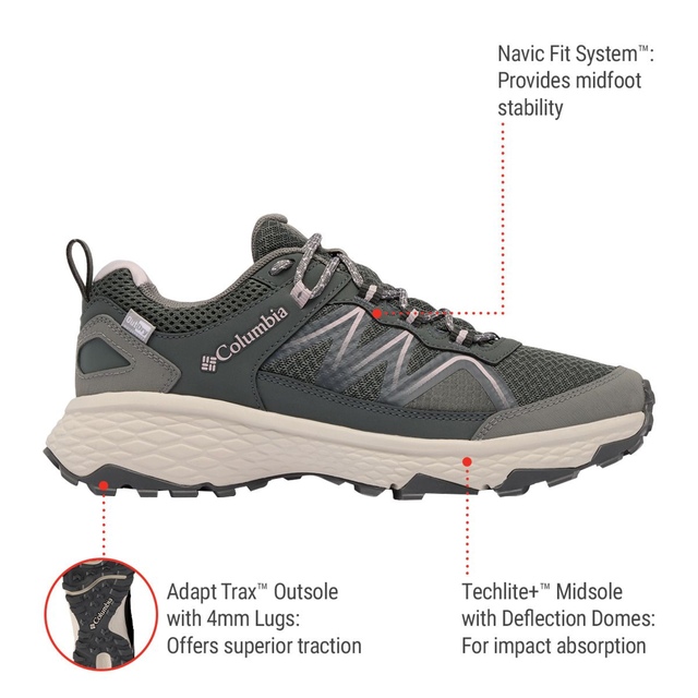 The Columbia Omni-Max Plus system features a cradled Techlite+ midsole for optimal balance, with forefoot and heel deflection domes that absorb impact
