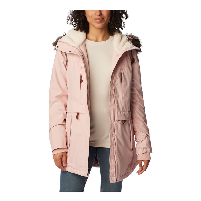 Attached, adjustable hood with faux fur lining protects against wind and precipitation.
