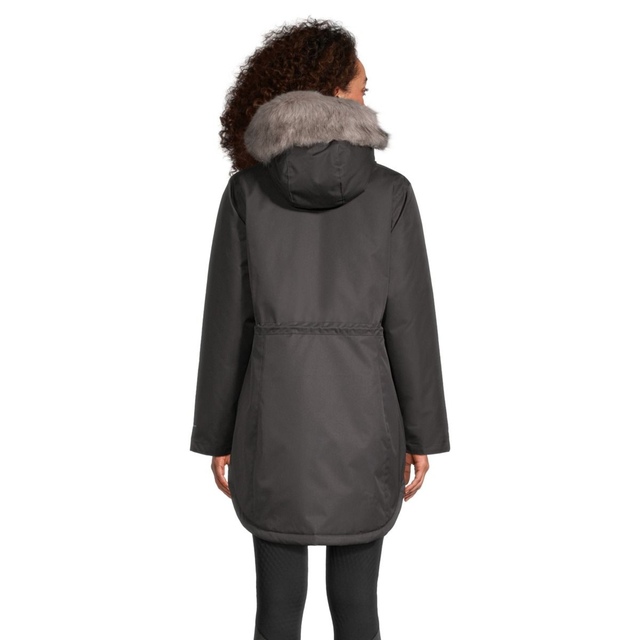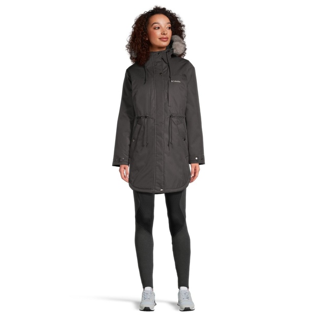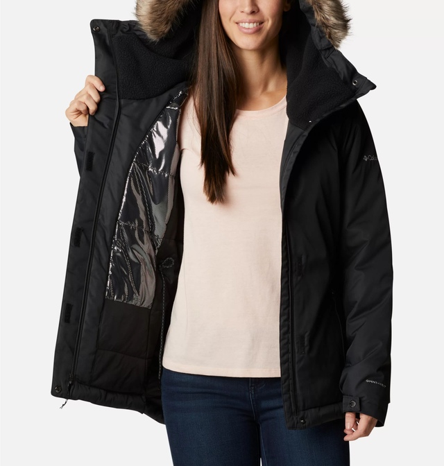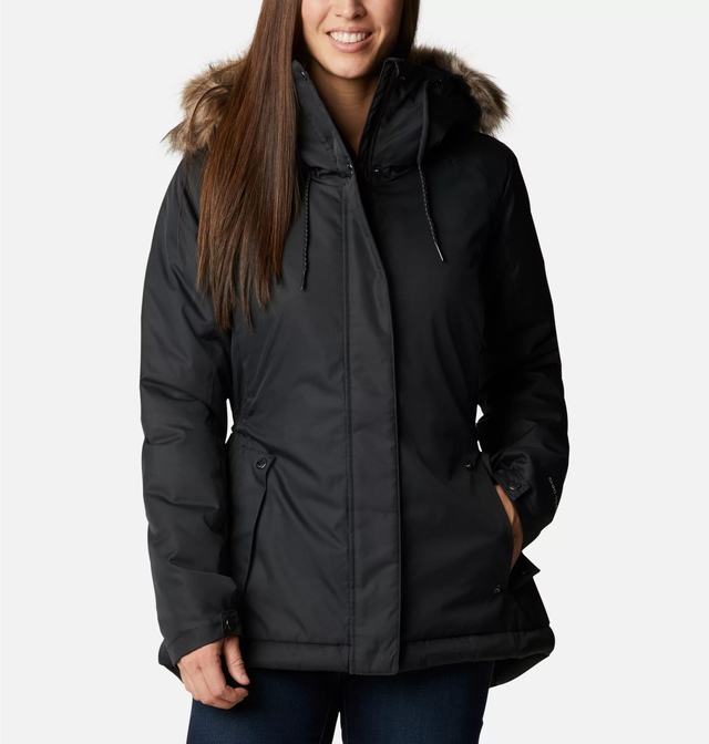This warm Columbia women’s jacket is insulated and thermal-lined to fend off frigid temps in style. A Sherpa-lined hood dials up the cozy, while the water-resistant shell repels light rain. Remove the faux fur trim or cinch the waist to instantly switch up your look.