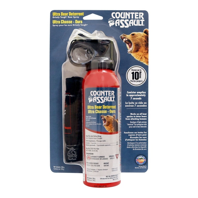 The Counter Assault 8.1 oz Bear Canister offers reliable protection when hiking, camping, hunting or visiting the cottage. Featuring a powerful, atomized blast of highly concentrated pepper spray, this product deploys up to 32 feet for seven seconds. Designed for easy use, this Counter Assault Bear Canister includes a durable nylon holster and is registered with the EPA.