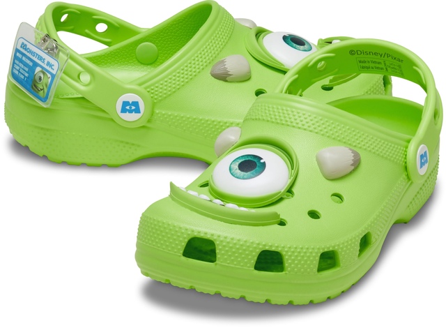 Incredibly light and fun to wear Made with our innovative Croslite™ compound, which now contains 25% bio-circular materials like cooking oil from other industries Dimensional Mike Wazowski face features fixed to upper Monster’s Inc. on footbed and rivet