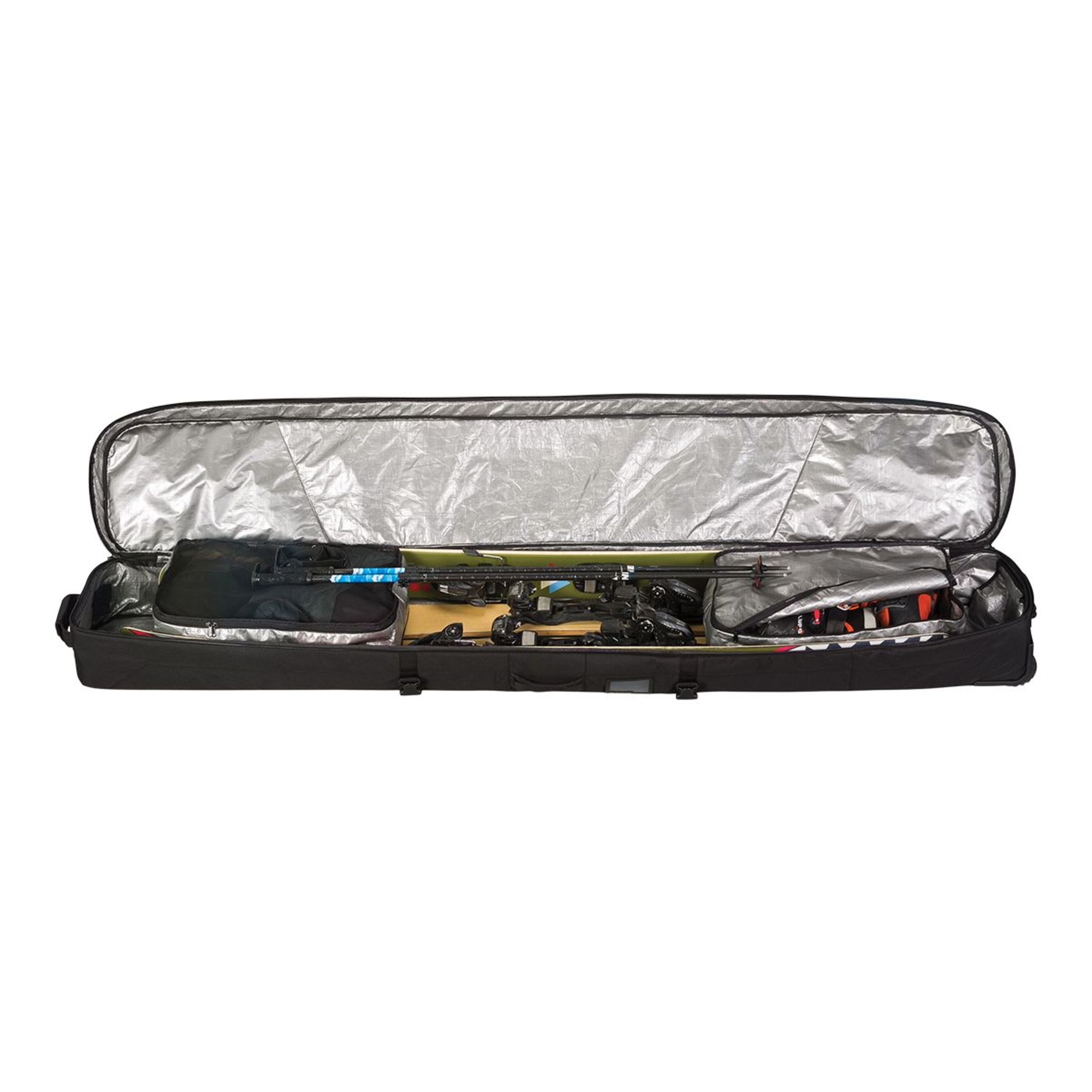 The Dakine Boundary 200cm Ski and Boot Bag is Dakine's fully-featured, most performance-oriented ski travel bag. Easily fits two pairs of skis and a set of poles, with removable tarp-lined boot bag that's great for stowing wet boots, and vented outerwear bag that lets apparel breath to minimize that "ski-trip musk." External dual compression straps and 360-degree padded ski protection let you secure your cargo and get it there safely. And the best part, our compatible handle system pairs with a rolling luggage bag, for easy one-handed rolling through an airport or train station. The Dakine Boundary 200cm Ski and Boot Bag is perfect for air travel, extended-length trips, and unpredictable locations where you need to be fully prepared.