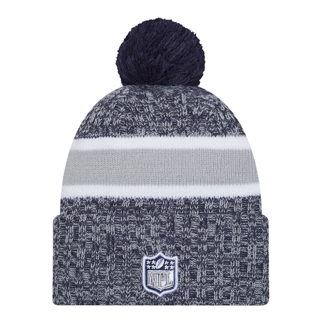 Dallas Cowboys 2023 Sideline Sport Knit is fleece lined with heathered team colour crown and cuff. Cowboys logo is embroidered on front and NFL logo embroidered on back. Uniform striping, unique to team, is woven into the crown and a solid team colour pom tops it off.