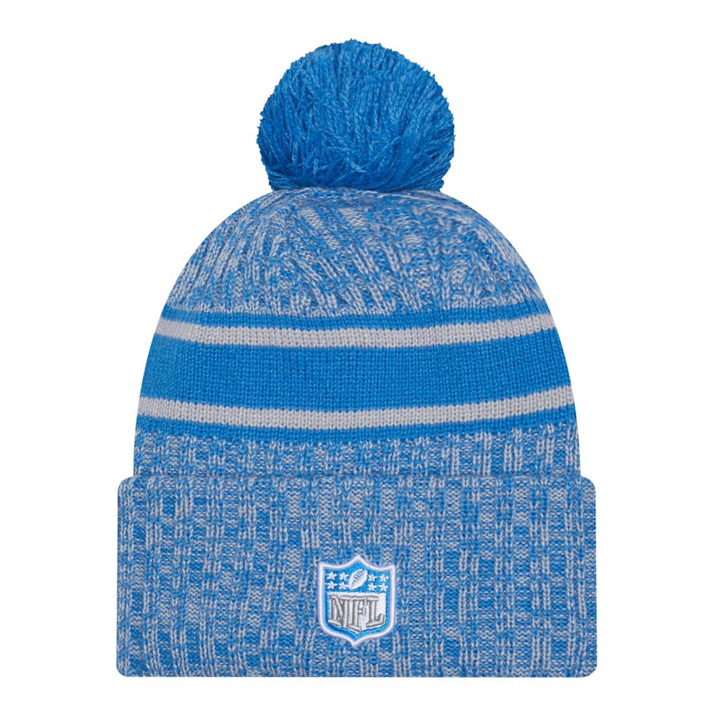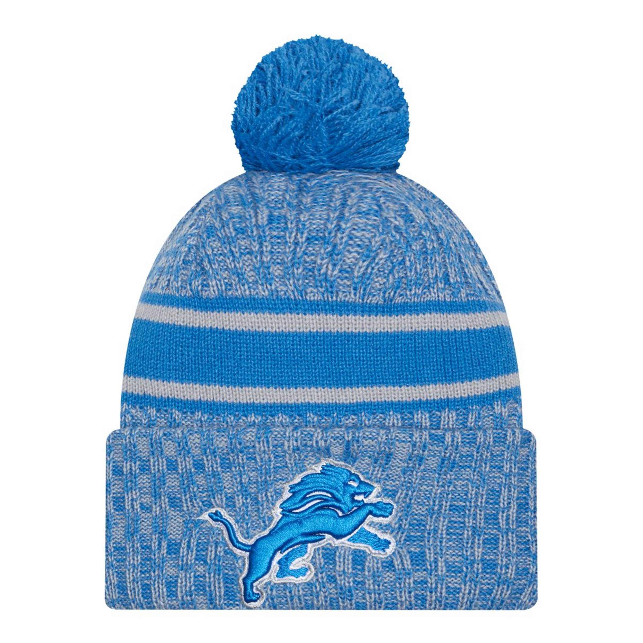 Detroit Lions 2023 Sideline Sport Knit is fleece lined with heathered team colour crown and cuff. Lions logo is embroidered on front and NFL logo embroidered on back. Uniform striping, unique to team, is woven into the crown and a solid team colour pom tops it off.