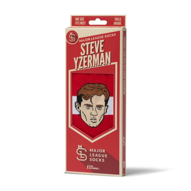 The Detroit Red Wings Major League Socks Steve Yzerman Player Socks celebrate the legendary hockey career of "The Captain" Steve Yzerman. The collectible packaging features official NHL Player Association branding, making these socks a must-have for hockey memorabilia collectors.