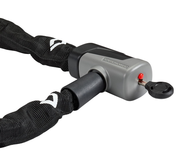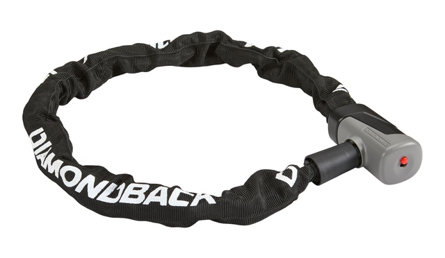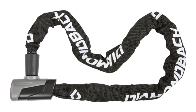 The Diamondback chain lock features hardened steel links that offer strong theft protection and easy-locking flexibility. Its durable brass cylinder keyed lock head ensures reliable security. The fabric cover prevents any scratches on your bike frame so you can keep riding with style.