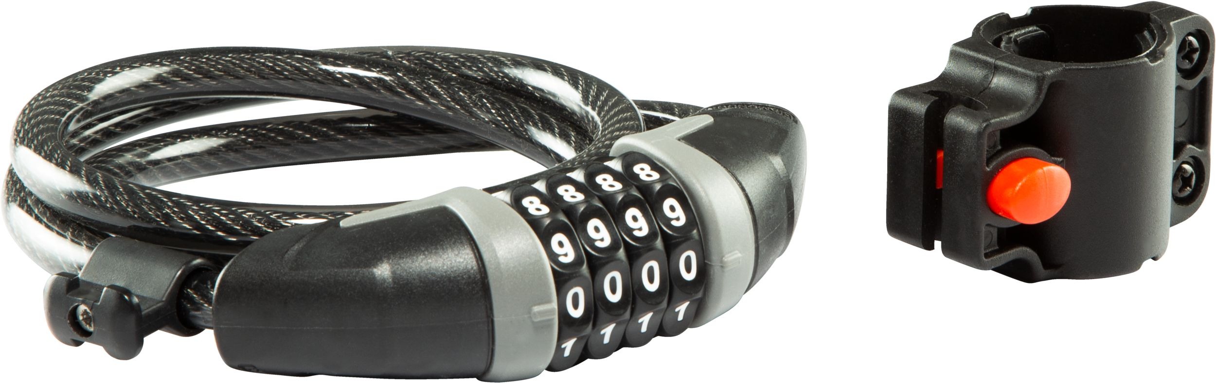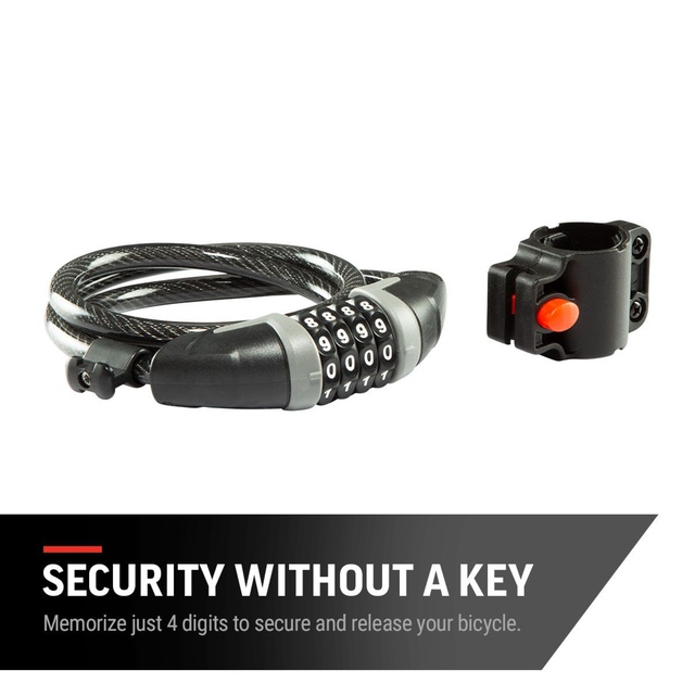 The Diamondback Combination Cable Lock offers convenient keyless security with its customizable 4-digit combination and 3.66 metre (12 foot) heavy-duty PVC coated cable. This versatile bicycle lock allows you to secure your bike to almost any rack or post with its lengthy yet portable cable. The sturdy construction and thick coating provide added protection against cutting, while the combination lock eliminates hassles of carrying keys. A mounting bracket is also included for easy transport when not in use.