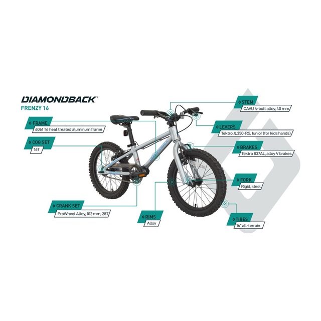 Please add it to your Wishlist for a notification when it’s back.The Diamondback Frenzy 16" Mountain Bike is built for the mini-shredder in your family to ride the trails with confidence! A lightweight aluminum frame design paired with riser handlebars and Tektro V-brakes create a comfortable and confident feel while learning to navigate trails