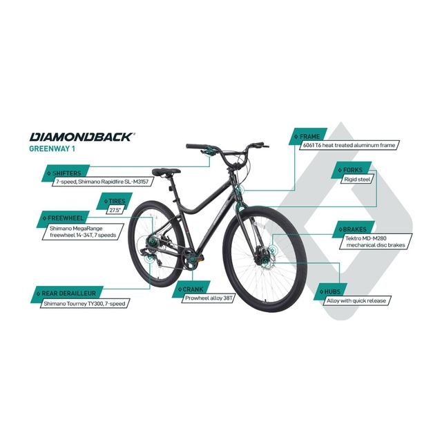 Introducing the Diamondback Greenway 1, the ultimate bike for urban commuters who want to get around town in comfort. This bike is designed with versatility in mind, so you can use it for everything from running errands to cruising the neighborhood. With its reflective sidewalls and Tektro HD-M280 mechanical disc brakes, you can ride with confidence in any weather or lighting conditions. So whether you're commuting to work, running errands, or just exploring the city, the Diamondback Greenway 1 is the perfect bike for the job. Reliable, and versatile, this bike is sure to become your new favorite way to get around town.